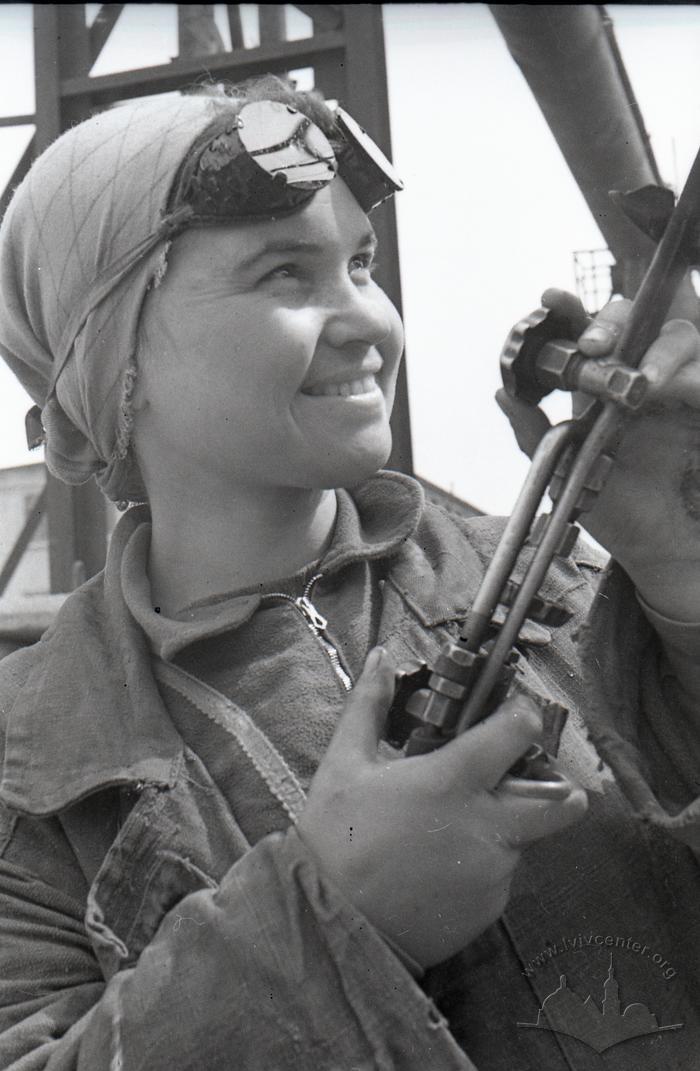 At the construction site of the blast furnace No. 6 of the Azovstal plant: Oxy-fuel cutting torch operator Rita Horbunova. April 1959.