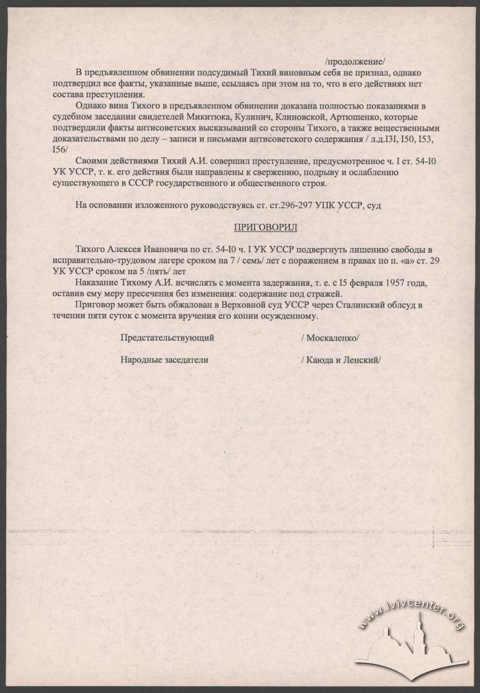 Копія вироку Сталінського облсуду УРСР Тихому Олексію російською мовою. Вказано склад судової колегії. Розгляд обвинувачень Тихому Олексію відбувався на закритому засіданні. Зі вставновлених даних було винесено вирок піддати Тихого Олексія Івановича позбавленню волі в Виправно-трудовому таборі на сім років