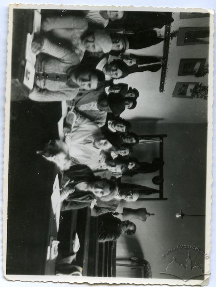 Гурок крою і шиття. Жінка у центрі з гудзиками без капелюшка — Ольга-Марія Жидачек. На звороті рік, позначки виробника фотопаперу Velox, штамп ательє Foto Radjo Palace, Lwow.