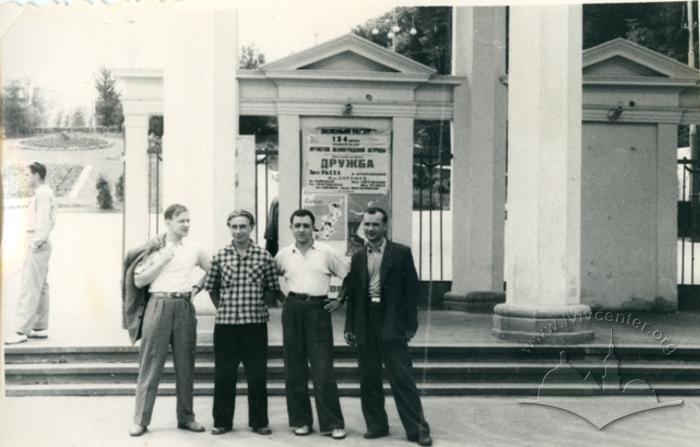 Портрет чоловіків перед входом до Центрального парку культури та відпочинку ім. Б. Хмельницького. Позаду афіша з анонсом концерту в Зеленому театрі парку "артистів ленінградської естради", зокрема відомого ансамблю "Дружба", з не менш відомою солісткою Едітою П'єха та художнім керівником Олександром Броневицьким.