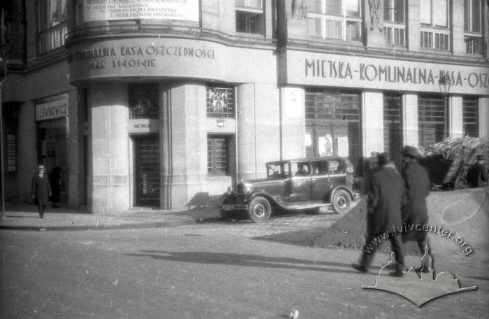 Вхід до колишньої Міської комунальної ощадної каси у Львові на вулиці Галицькій. Чиншовий будинок, зведений за проєктом Юзефа Сосновського і Альфреда Захарєвича у 1910 році. У 1931 році за проєктом Вавжинця Дайчака крамниці партеру переробили у конструктивістському стилі на банківське приміщення Міської комунальної ощадної каси.